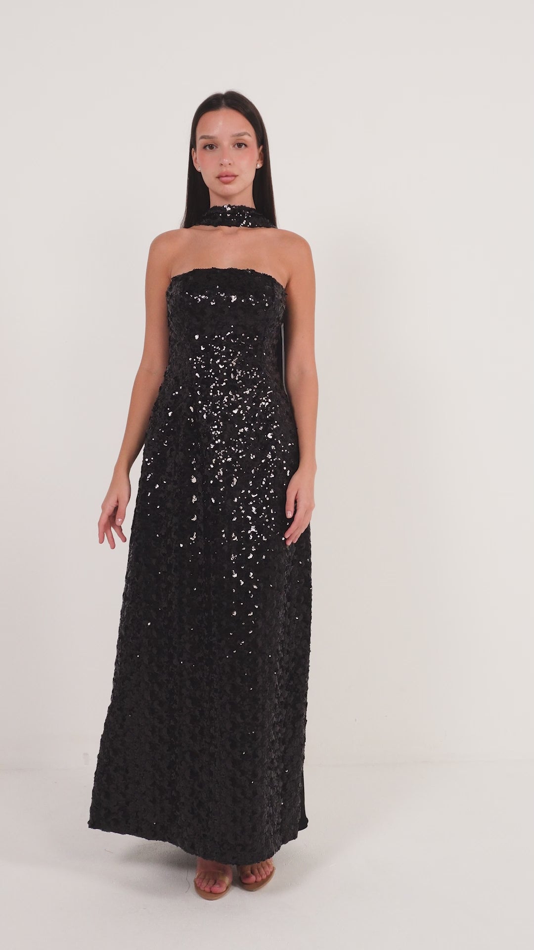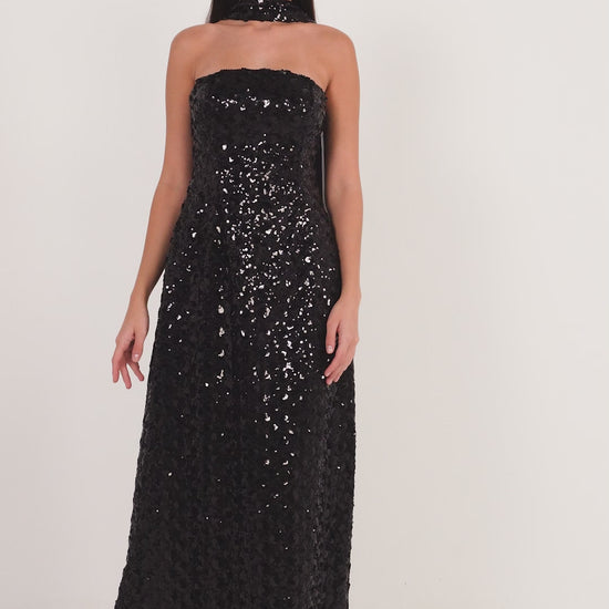 فستان اسود ترتر مع شال شيفون